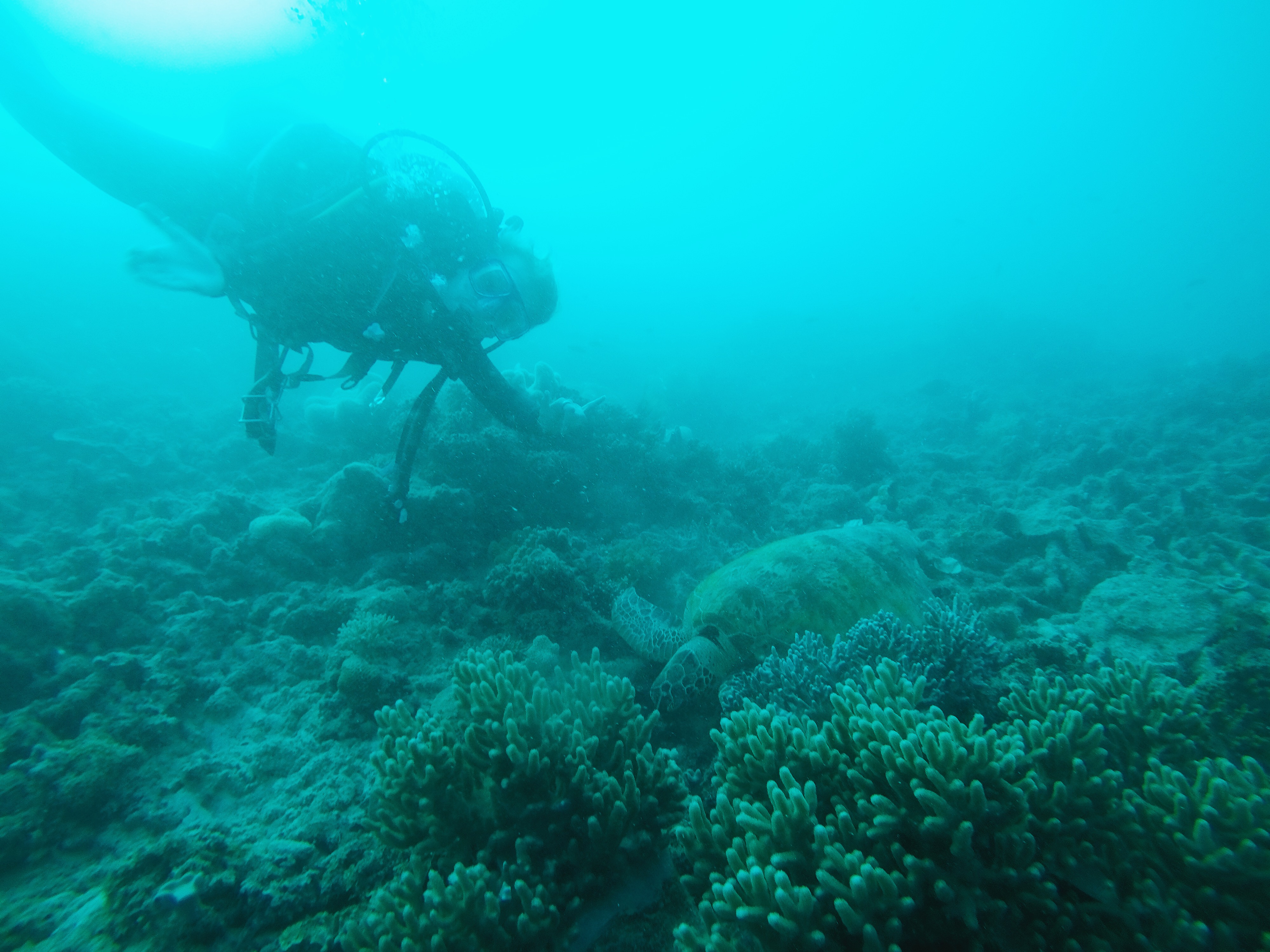 A delicious pb&j later, we were onto our next reef, Manta Ray Bay. Ever since watching Racing Extinction in high school (please watch it, its one of my favorite environmental movies) I have dreamed of diving with a manta ray. They are such elegant and majestic creatures, but sadly, they are really rare to see nowadays. However, I did get the chance to hang out with a sea turtle for at least five minutes and saw even more incredible wildlife.