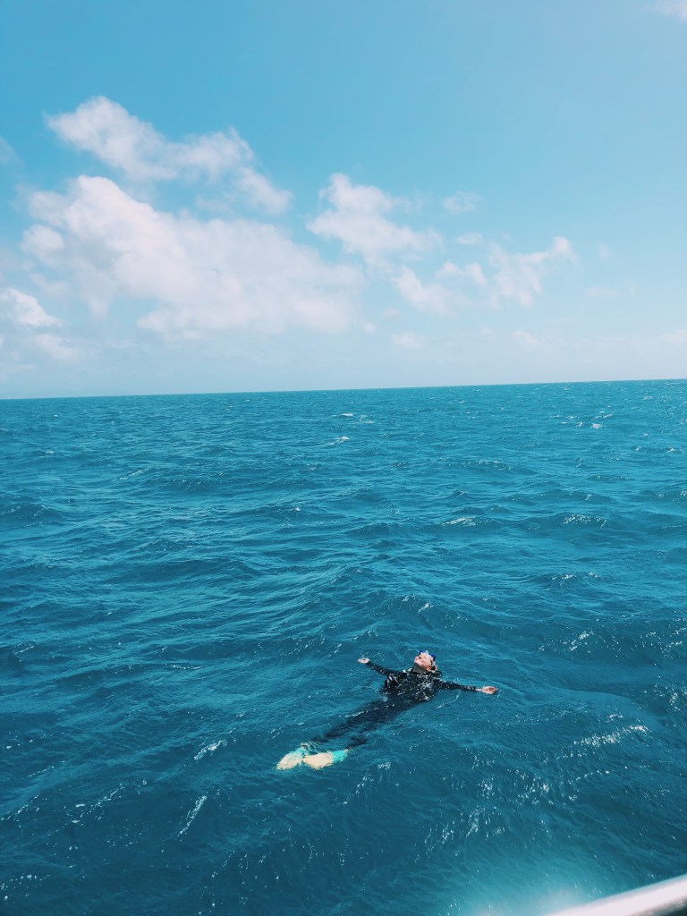 Soon enough, we were making way towards the reef. As the clouds rolled in, the small boat rocked from side to side, getting pushed by every wave and gust of wind. Overestimating the strength of my stomach, I chose not to buy motion sickness pills beforehand, so I spent the entire three hour boat ride gripping the rails, staring out ahead, and clenching my teeth to hold down anything that might potentially come up. Surprisingly, I was stronger than some of the others who spent their morning puking overboard. After what seemed like a lifetime, the boat slowed down and it was time to gear up.