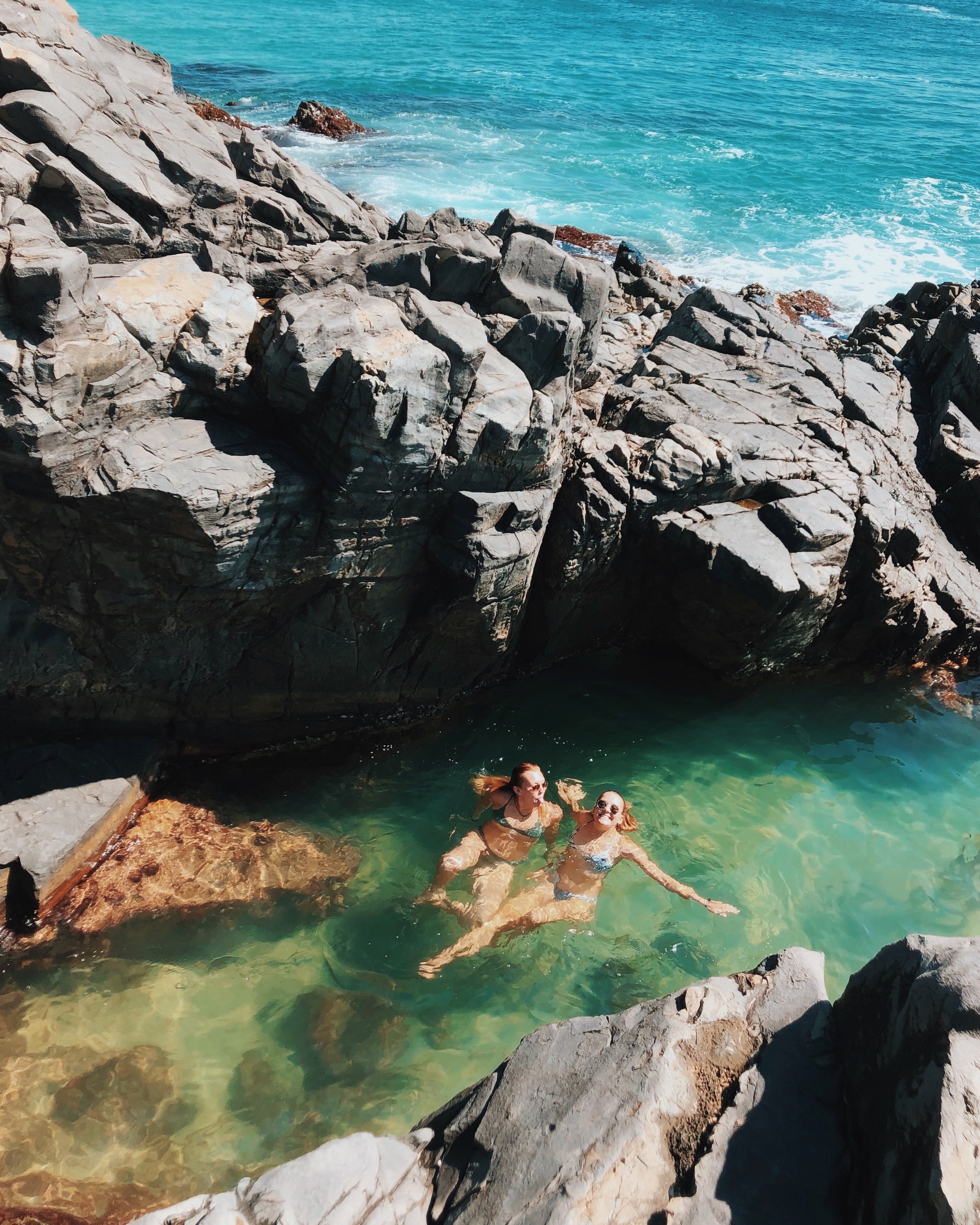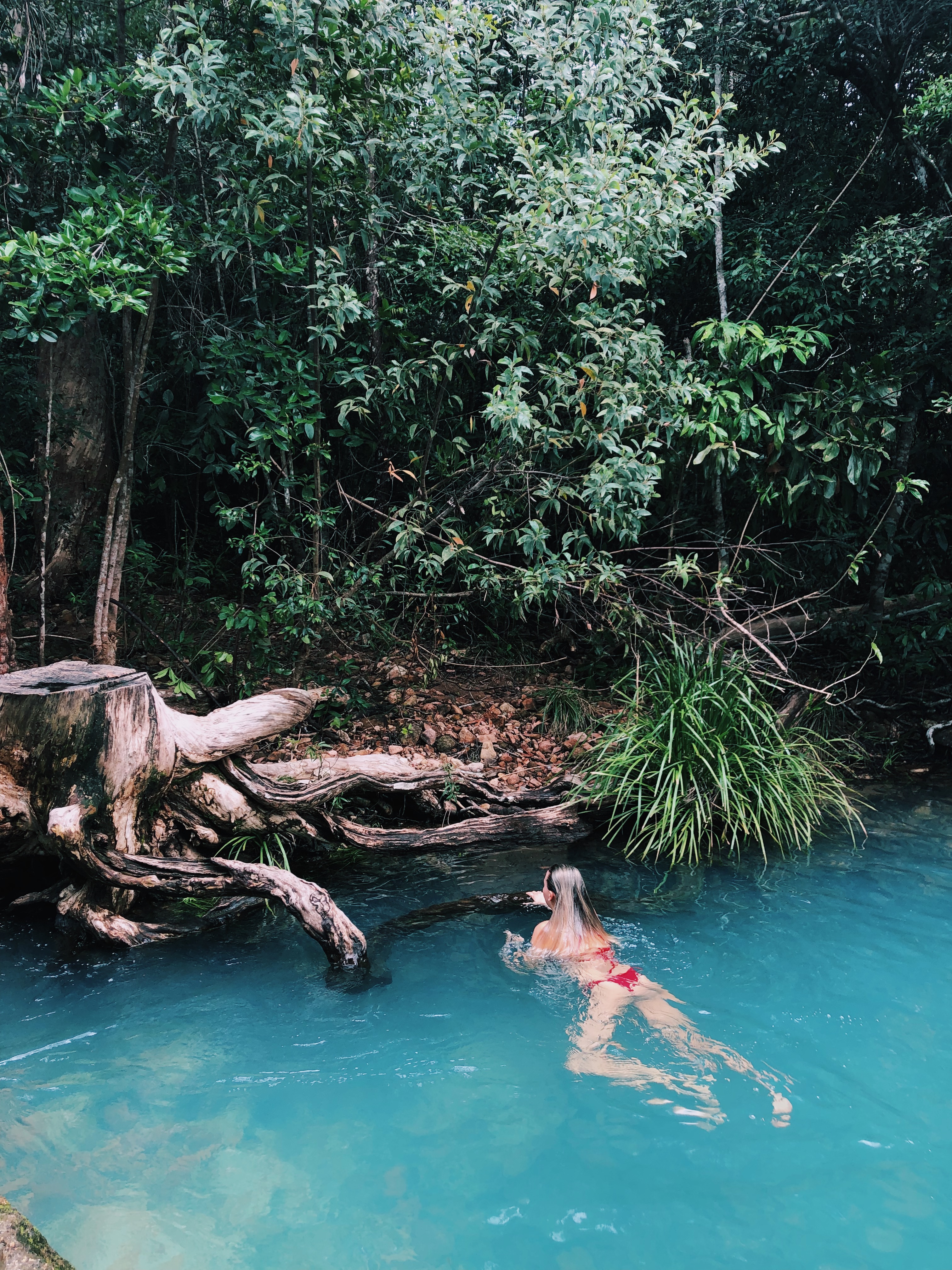 Rudely awoken by the harsh humidity of the wet tropics and sun glaring through the windows, we sprang up eager to start our day. Due to this new sleep schedule, our morning ritual quickly became coffee and peanut butter jellies for our early breakfast. Although we were only a short drive from the iconic Wallaman Falls, our empty gas tank and zero cell service halted us from seeing it. Instead, we cruised down the entire mountain, only breaking for the occasional cow in the middle of the road, and praying we made it to the gas station. To our luck, we did. It was the most relief we felt in hours. Agreeing that we did not want to drive up that god-forsaken mountain again, we carried on with our journey, this time to the Cardwell Spa Pools. I was shocked to find that the pools looked exactly like they did on Instagram, perfectly blue, peaceful, and inviting. There was only one couple there when we arrived so it felt like our own little playground. As rain fell down on us, the moment became even more magical, and I felt so lucky to be on this journey, and bless as hell to have survived the night.