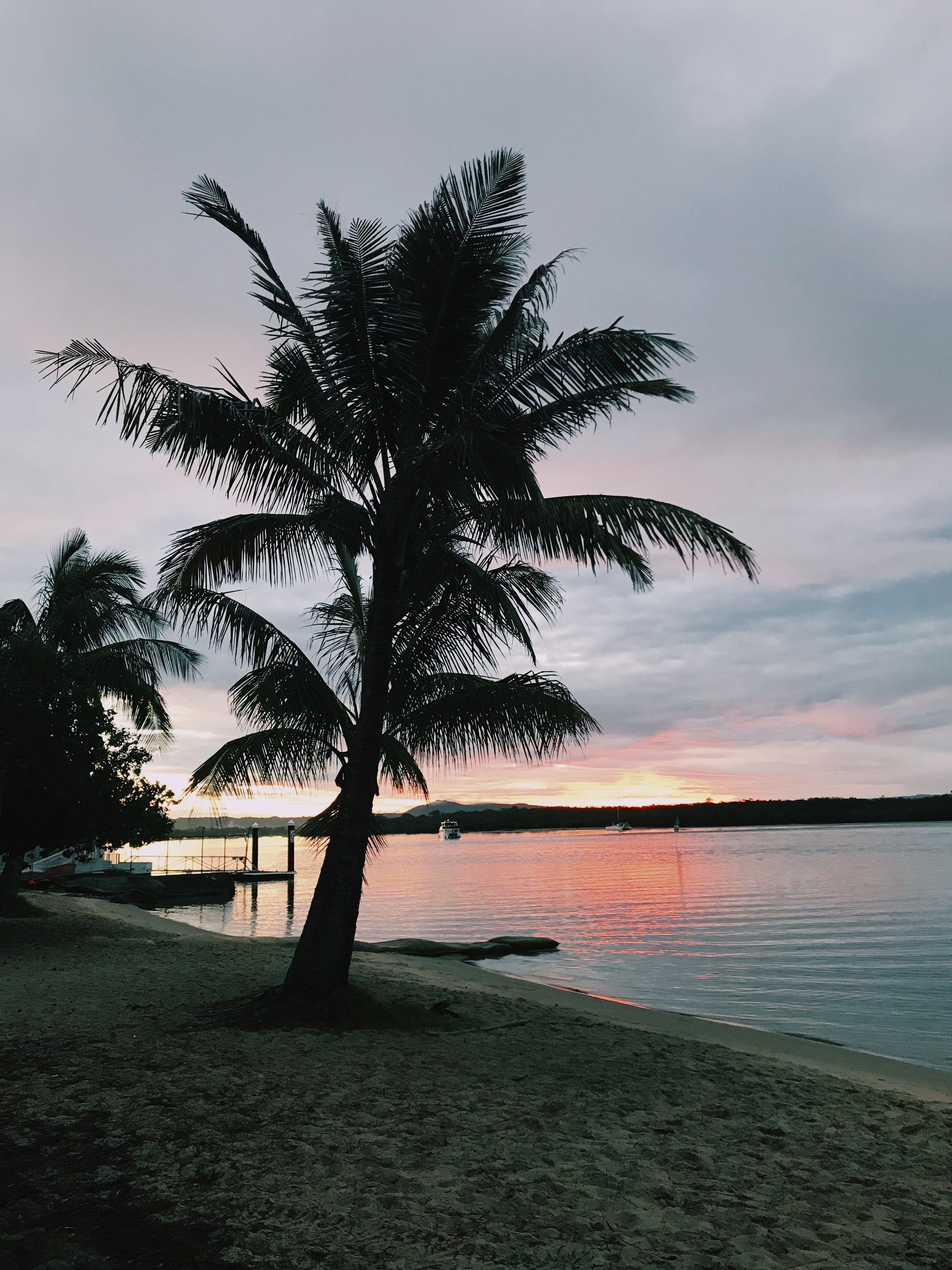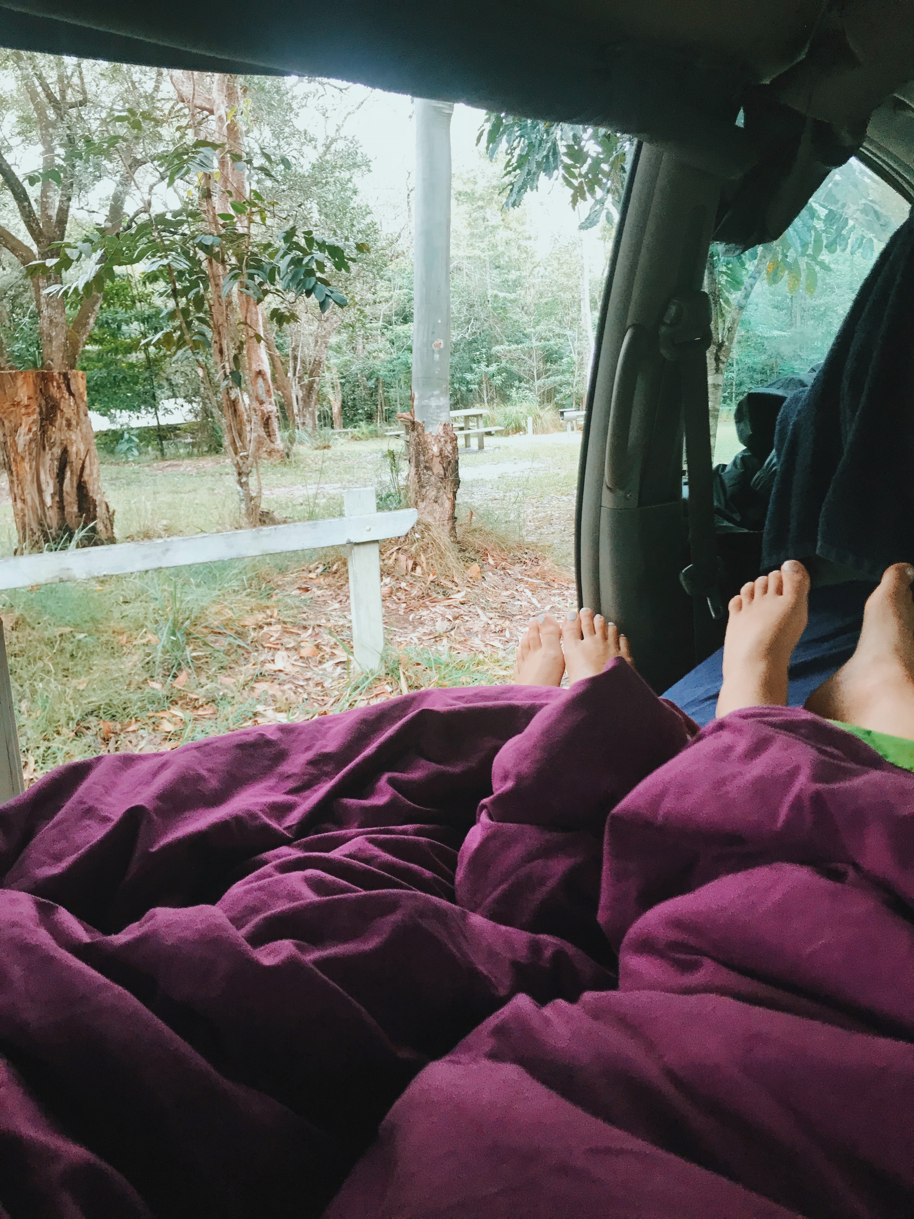 The entirety of the Bruce Highway past Rockhampton had absolutely zero places to pull over without getting hit by a semi truck, or getting stuck in the mud due to the rain, so we kept going. An hour before sunrise, we drove past a camping sign for Lake Monduran, aka our saving grace. The campsite was full of fishermen’s boats and also what consisted of the best one hour nap we ever had (we being Julia and me, as Kayla had been asleep for about 10 hours already). A fisherman probably wondering why there was suddenly an obnoxious lime green and purple van next to his, woke up Julia by staring through her window. A little freaked out, but with a new boost of energy, she started the car and floored it to Rainbow Beach. After what seemed like a lifetime, we finally made it to Noosa.